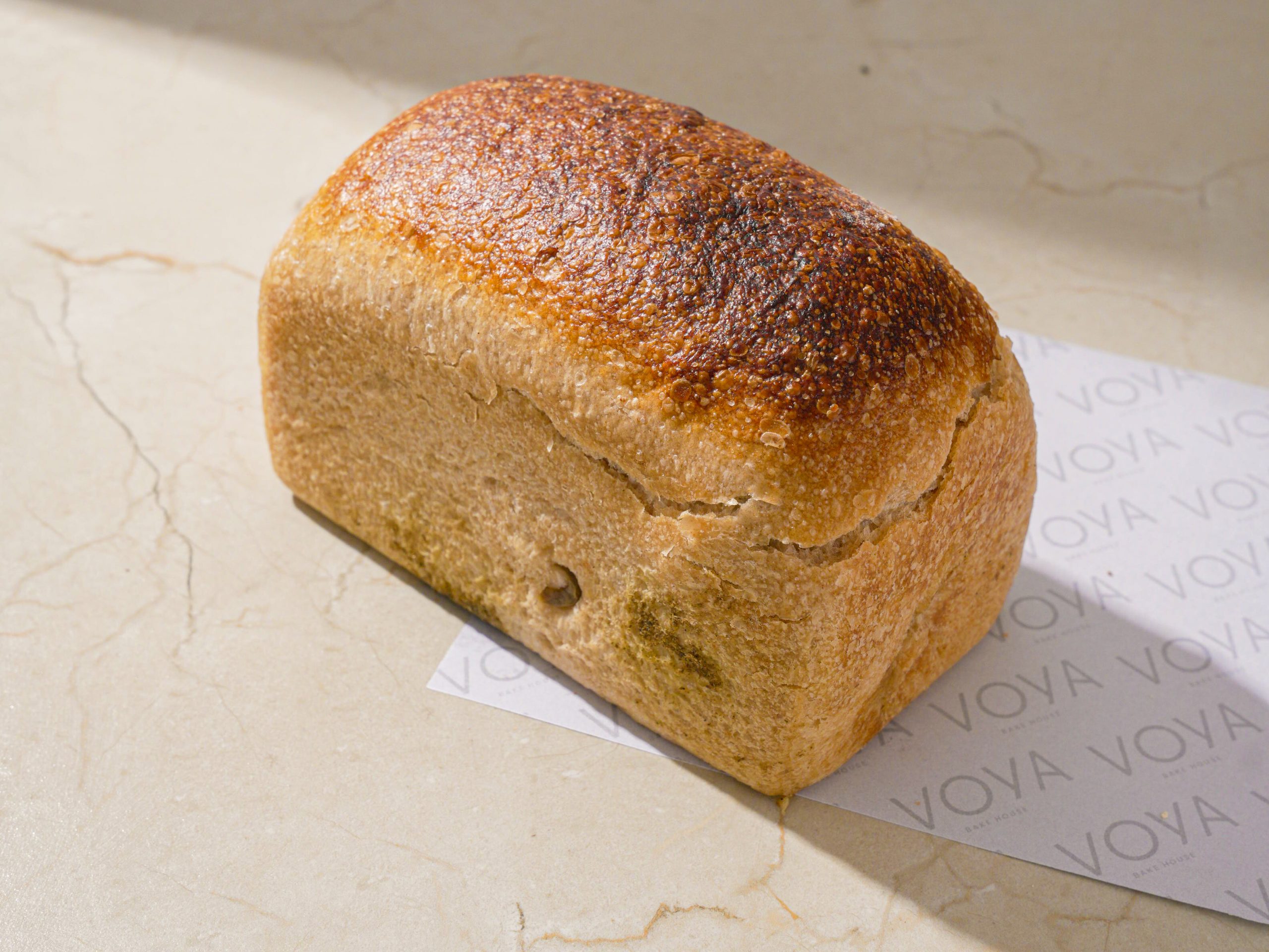 A Rectangle, slice-friendly Olive and basil sourdough loaf with a balanced sour note — fermented slowly for richness.